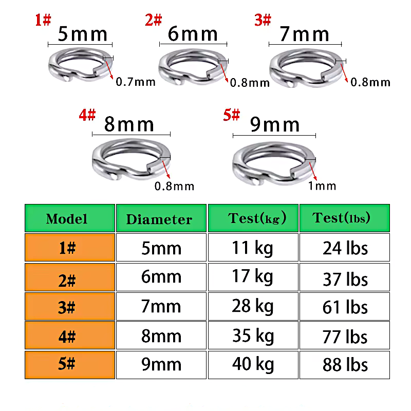 Premium Quality Stainless Steel Fishing Split Rings which are strong and reliable...chooses your size and quantity. Please see image above which shows the strength and size data. Ideal for lures, spinners, rigs, swivels, weights etc.